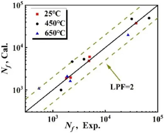 4.建立了滞后能量模型以及疲劳寿命、滞后能量和温度之间的关系,有效地评估和预测了SLM Inconel 718的LCF寿命。根据不同温度下的损伤机理关系和模型参数,增加W0和β可能有利于提高LCF在整个使用温度范围内的寿命。