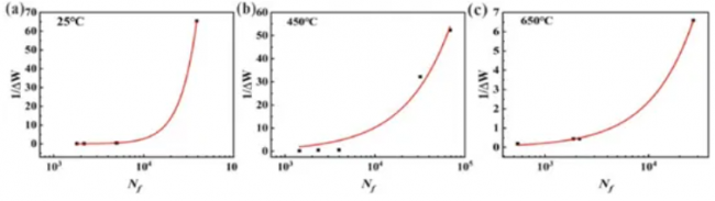 图14. (a-c)不同温度下的循环滞后能量曲线;(d) 滞后能量与失效循环次数的关系