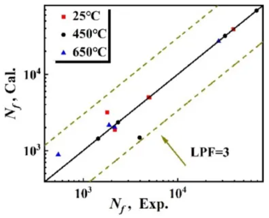 从图18可以看出,当Ostergren模型应用于SLM Inconel 718的寿命预测时,当总应变幅度为0.6%(450°C)时,预测寿命在3倍的误差范围内,预测精度较低。与Ostergren模型相比,滞回能量模型的预测寿命在两倍的误差带内,因此更适合SLM Inconel 718低周疲劳寿命预测。