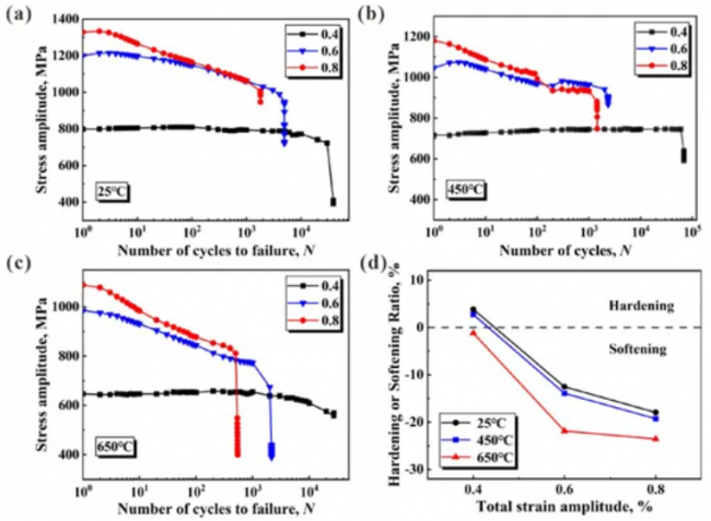 总应变振幅和寿命的变化趋势如图4a所示,25、450和650°C下塑性、弹性和总应变振幅随载荷的变化如图4b-d所示。在相同的应变振幅(0.4%、0.6%、0.8%)下,寿命最低出现在650°C,最高出现在25°C。在所有温度下,弹性应变振幅占大多数,并起主导作用。