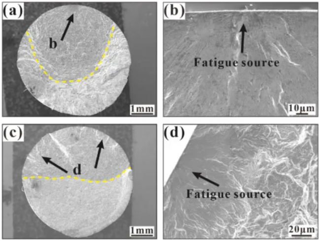 SLM Inconel 718的疲劳断口由裂纹成核(箭头所示)、裂纹扩展和最终断裂区域(以黄色虚线区分)组成。在室温和450°C下,断裂面存在多源。疲劳源类型为图7b中的小面和图7c中RT时的侵入或挤压裂纹,这也是锻造Inconel 718合金的常见失效模式。在每次LCF加载过程中,样品表面会形成一定量的挤出或侵入,挤出或侵入的量在数值上等于Burgers矢量。随着随后的疲劳载荷,应力集中将在侵入位置形成,这可能是疲劳裂纹的萌生和疲劳源的发展。疲劳源类型为图7e中的AM缺陷(孔隙)和图7f中450°C下的正常裂纹。在650°C的高温下,在=0.4%的样品中仅观察到一个正常的表面裂纹疲劳源(图8a-b)。其余部分表现出明显的多源开裂特征,没有小面开裂和增材制造缺陷开裂,如图8c-d所示。