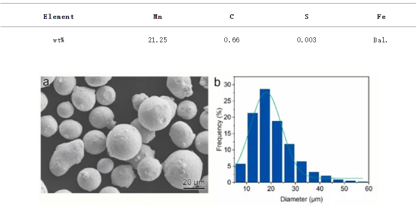 图1.(a) SEM图像显示了Fe-21Mn-0.6C粉末的形态和尺寸分布。