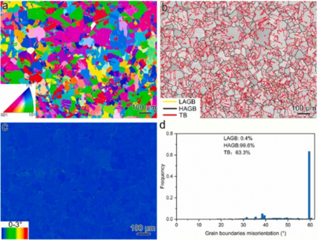 图7. EBSD研究竣工垂直。(a) IPF-Y颜色图,(b)晶界分布图(黄色:LAGBs,黑色:HAGBs,红色:TBs),(c)KAM图,(d)FCC奥氏体相中LAGBs、HAGBs和TB的频率。