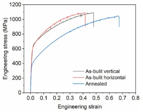 图11. LPBF制备的Fe-21Mn-0.6C和退火样品的工程应力-应变曲线。