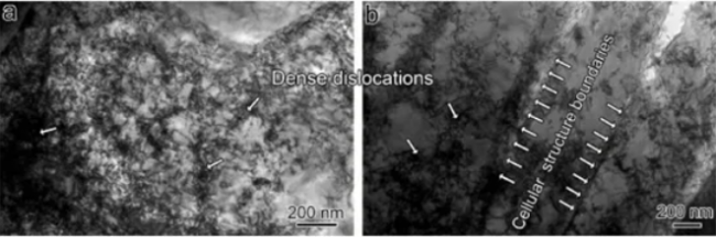 图12. 亮场TEM图像显示了竣工样品(a)在晶粒中和(b)在蜂窝状结构中的密集位错(白色箭头)(两排白色箭头表示蜂窝状结构边界)。