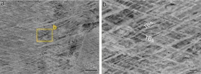 图14. SEM BSE图像显示(a)断裂的竣工拉伸样品的整体微观结构和(b)变形孪晶的特写。