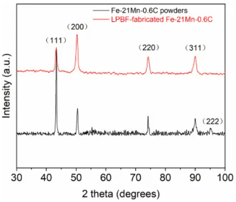 图5. Fe-21Mn-0.6C粉末和LPBF制备的Fe-21Mn-06C钢的XRD图谱。