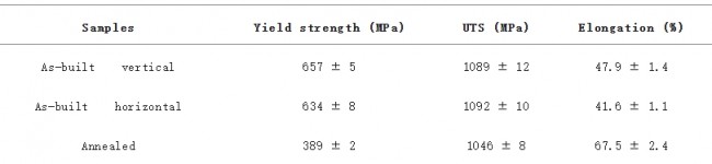 图11中的退火拉伸样品是从图9中的退火样品中水平提取的,该样品经历了完全再结晶,并表现出具有弱各向异性的等轴晶粒,如图9、图10中的发现所示。结果,在水平方向上获得的拉伸样品可以反映退火样品的机械特性。