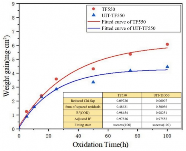 从图8可以看出,在100小时高温氧化实验中,激光熔覆TF550钛合金的增重最大,施加UIT的激光熔覆TF550钛合金表面氧化产物增重明显低于无UIT处理试样。在高温氧化实验开始时,曲线的斜率较大,表明氧化增重速率较大,40h后曲线斜率变小,曲线趋于平缓,进入稳定氧化阶段,也符合抛物线规律,表明长期高温氧化使材料表面成为致密连续的氧化膜,阻止氧的相互扩散,减慢氧化反应,从而降低氧化速率,氧化增重速率也降低。