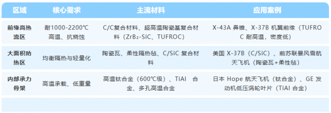 高速飞行器舵/翼按热流分布可分为前缘高热流区、大面积防热区、内部承力骨架,不同区域材料选择需精准匹配环境需求:
