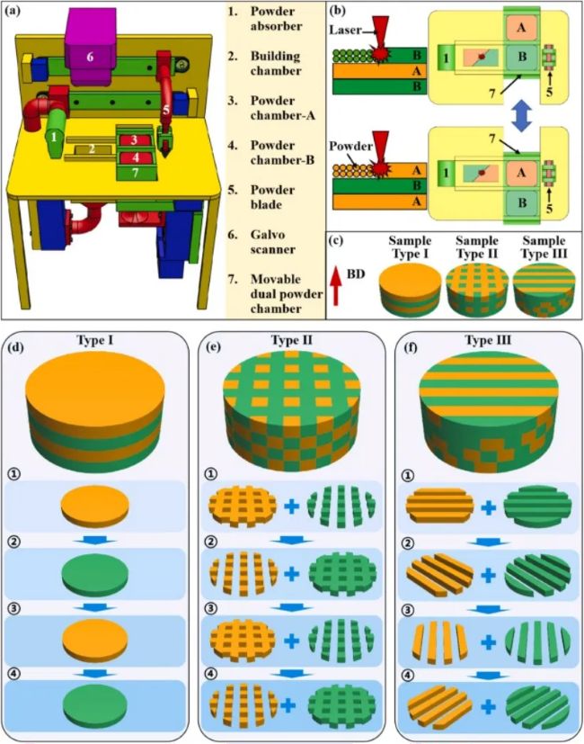 图 1. (a)内置可移动双粉末室装置的国产双金属MM-LPBF增材制造系统示意图,(b)双金属打印工艺,(c)分别具有交错多层平面(I型)、交错多层棋盘(II型)和交错多层旋转光栅(III型)异质结构的三类双金属集成块状材料,以及(d)I型数字模型的解构,(e)II.型,以及(f)III.型。