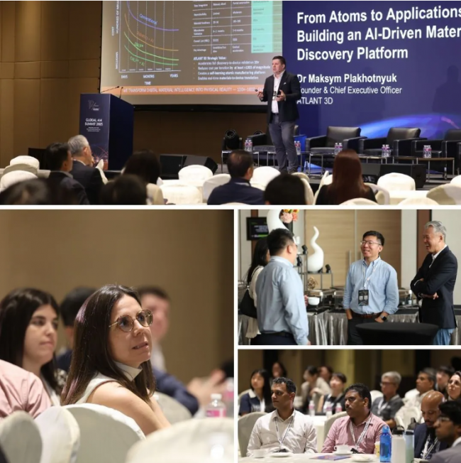 当日议程在ATLANT 3D公司首席执行官Maksym Plakhotnyuk博士的主题演讲中开启。他深入阐释了人工智能与原子级硬件技术的融合如何开启材料发现的新纪元。通过ATLANT 3D开创性的AI驱动直接原子层处理平台,Plakhotnyuk博士生动展示了智能自动化如何加速半导体、量子技术及太空领域的技术创新——有力证明了制造业的未来始于原子层级。