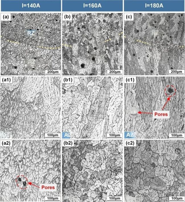 图17 电弧电流对电弧增材制造铝合金的影响机理,(a1-a3) I=140A;(b1-b3) I=160A;(c1-c3) I=180A