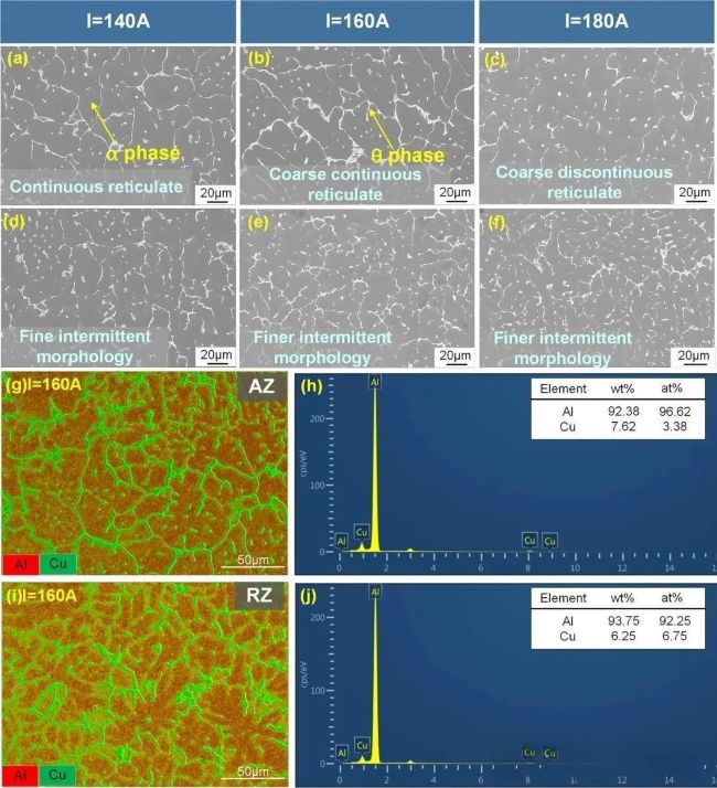 图9 高倍扫描电子显微镜观察图像,(a-c) 不同电弧电流下电弧熔化区(AZ)图像;(d-f) 不同电弧电流下重熔区(RZ)图像;(h-j) 能量色散谱(EDS)映射结果