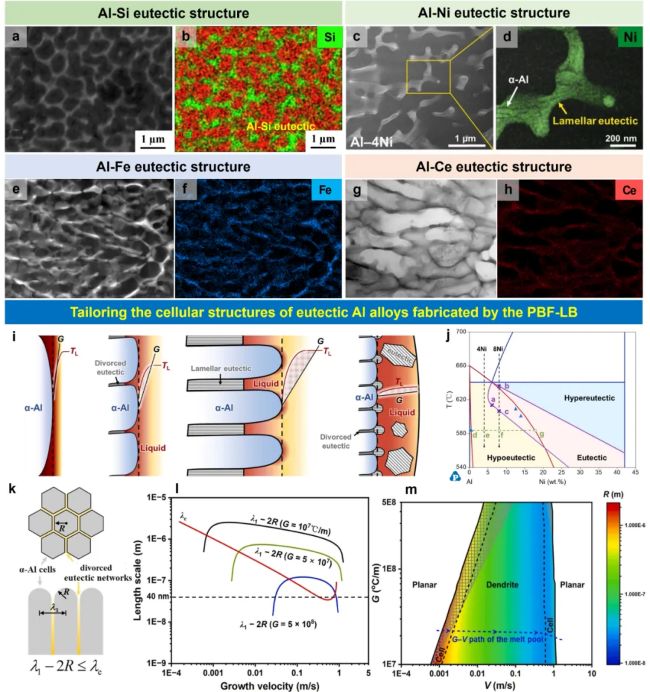 图24(a,b)铝-硅共晶;(c,d)铝-镍共晶;(e,f)铝-铁共晶;(103,g,h)铝-铈共晶。211(i)液态熔池自下而上S/L界面形貌示意图。(j)铝镍相图富铝侧。(k)α-Al晶胞结构及分离共晶网络示意图;(l)Al-8Ni合金中不同晶界宽度(G)对应λ1−2R和λe随生长速率的变化规律。理论上,晶胞间距/枝晶间距应通过α-Al晶胞间距(λ1)与α-Al尖端直径(2R)之差进行近似计算。(m)Al-5.6Ni合金在G-V空间的显微组织选择图谱。