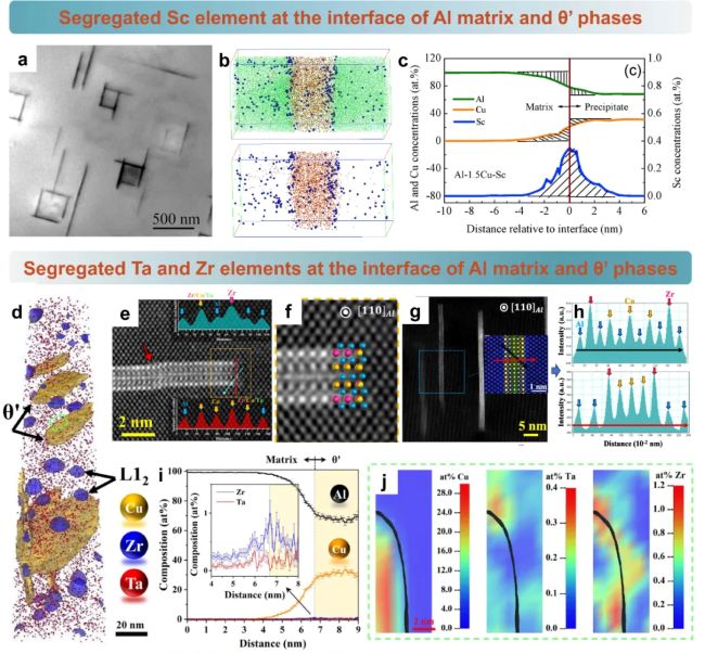 图25 (a)透射电镜图像显示Al-1.5Cu-Sc中的θ′析出相。(b)三维原子点阵图展示截面θ′析出相及铝、铜、钪原子分布。(c)θ′/基体界面处的钪偏析现象。262(d)铝-铜-锆-钽时效样品的原子位错重构。(e)红色箭头指示由协同成核形成的既有晶片与新生晶片的界面,插图为蓝色和红色线条对应的线强度分布。(f)高倍放大下,晶片尖端晶体结构重叠示意图(橙色铜、蓝色铝、品红色锆、绿色钽)。(g)θ′晶片析出相的高角角分辨STEM显微图及定量强度分布图。(h)分别对应(g)中黑色和红色线条的线强度分布。(i)θ′晶片一维成分分布图,(j)θ′晶片截面二维等高线图显示界面处铜、钽、锆元素分布。