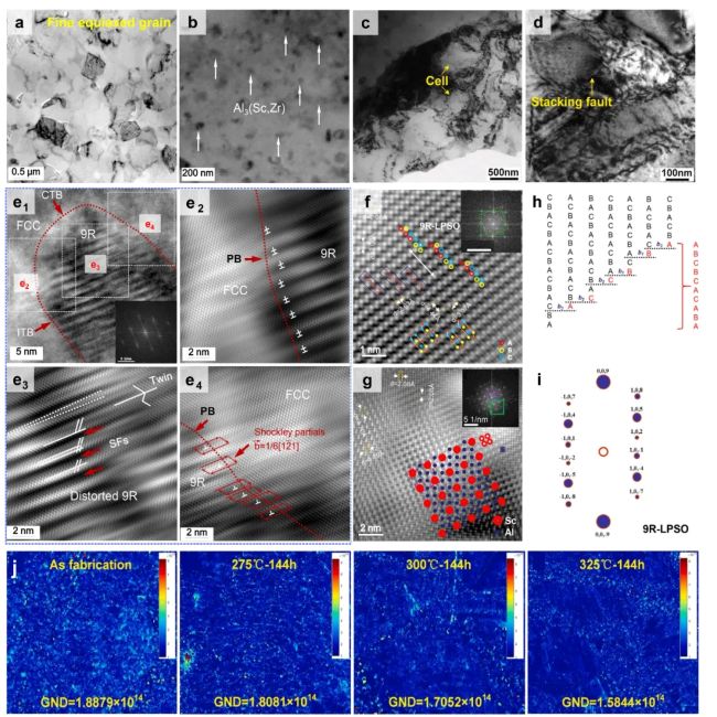 图22 L12颗粒的显微结构:(a)Al3(Sc,Zr);(b)Al3(Sc,Er);(c)纳米L12析出相与铝基体的界面;(d)Al、Al3Sc和Al3(Sc,Zr)晶胞示意图;(e)经640°C均质化8小时后,Al-0.08Zr-0.014Sc-0.008Er-0.10Si元素在375°C等温时效24小时和21天,或400°C等温时效24小时和11天的三维(3-D)原子位错点重构;(f)基体/析出相界面的浓度分布图。(g)L12颗粒的存在会阻碍位错运动。247(h)比较了基础合金(Zr + Er)、铬改性合金(Zr + Er + Cr)和锌改性合金(Zr + Er + Zn)在300°C蠕变测试中,L12纳米析出相的晶格参数失配与归一化阈值应力的对比;(i)不同钪、锆含量铝合金的异形相和非晶相。通过共改性钪和锆纳米颗粒成功引入均质超细等轴晶粒,这有助于形成预期的原位Al3(Sc,Zr)成核粒子。