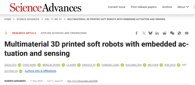本期谷·专栏所分享的是上海交通大学的研究团队在《Science Advances》上发表的一项突破性研究,他们开发了一种集成化多材料3D打印技术,能够像“一体化成型”那样,自动制造出集驱动、传感、电路和通信功能于一身的自主软体机器人。