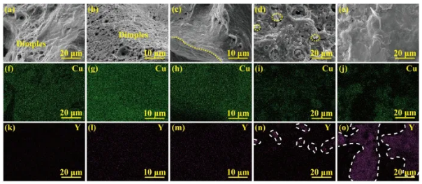 CuCrZr和CuCrZr-0.5 wt% Y₂O₃样品的断口表面表现出韧性特征,表明韧性断裂。相比之下,CuCrZr-1.0 wt% Y₂O₃样品的横截面显示出类似“山川”的形态(用黄色虚线轮廓),这是脆性断裂的特征。