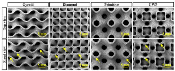 每个样品均表现出完整的表面结构,未观察到明显的缺陷或裂纹。I-WP点阵结构在正视图中表现出最严重的粉末粘附。