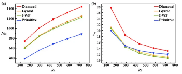 Nu随雷诺数显著增加,而f减小。这种行为的发生是因为较高的雷诺数对应较高的气流速度,这破坏了点阵表面上的热边界层,增强了换热效率。同时,速度的增加改善了边界层与外部流体之间的动量传递,减少了由流动分离引起的压力损失,从而降低了摩擦系数。总体而言,在此雷诺数范围内,基于Nu的换热性能排序为Diamond > Gyroid ≈ I-WP > Primitive。