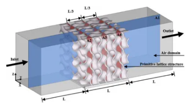努塞尔数(Nu)和摩擦系数(f)是评估点阵结构换热性能的关键无量纲参数,它们共同影响换热效率和能耗之间的平衡。Nu反映了流体-点阵界面处的对流换热强度,其中较高的Nu表示更好的换热效果。TPMS点阵结构,由于其复杂的孔隙几何形状,增强了湍流混合和边界层破坏,与传统散热结构相比具有更高的Nu。f衡量点阵的压降,较大的f表示更大的能量损失和流动阻力。TPMS点阵结构的高比表面积和曲折的流道增加了f,在流体流动过程中加剧了压降。