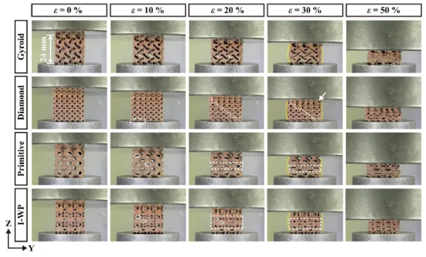 由弹性模量和峰值平台应力评估的压缩机械性能排序如下:Diamond > Gyroid > I-WP > Primitive。这些差异主要源于每种点阵结构特征所固有的不同变形和失效模式。