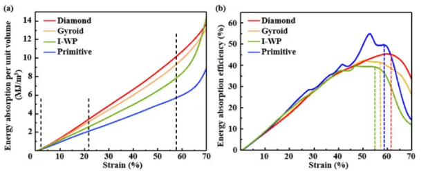 在弹性变形阶段,所有四种晶格结构的能量吸收值都呈线性增加,并保持可比性。在进入应力平台和连续失效阶段后,能量吸收排名遵循Diamond>Gyroid>I-WP>Primitive。总体而言,能量吸收曲线的平滑性没有明显的波动,这表明晶格结构具有良好的塑性和稳定的能量吸收性能。