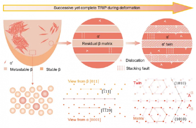 图7: 示意图总结了完整的“两步 TRIP”变形机制。第一步,在初始塑性变形阶段,亚稳 β 相部分转变为初生 TRIP α’ 马氏体板条。第二步,随着应变进一步增加,剩余的 β 基体完全转变为次生 TRIP α’ 马氏体板条,并与初生板条形成相互孪晶关系。这种独特的顺序相变与孪生机制,是实现超高加工硬化率和良好塑性的核心。