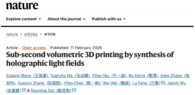 该成果于北京时间2026年2月12日以《基于全息光场合成的亚秒级体积三维打印》(Sub-second Volumetric 3D Printing by Synthesis of Holographic Light Fields)为题发表在《自然》(Nature)上。