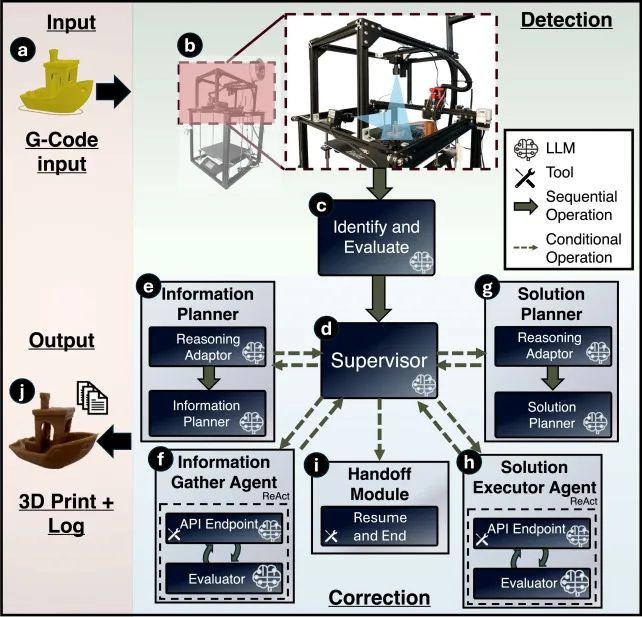 图1:提出的框架示意图。(a)将零件的G代码文件上传至3D打印机。(b) 打印机配备两个安装在框架上的摄像头。(c) 每层打印完成后,捕获两张当前打印状态的图像供LLM分析。(d, e) 如检测到故障,监督LLM调用信息规划器。(f) 执行器执行信息收集计划。(g) 随后,监督器激活解决方案规划器。(h) 另一执行器执行解决方案计划。(i, j) 循环结束,监督器调用交接模块恢复打印。